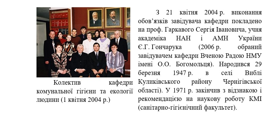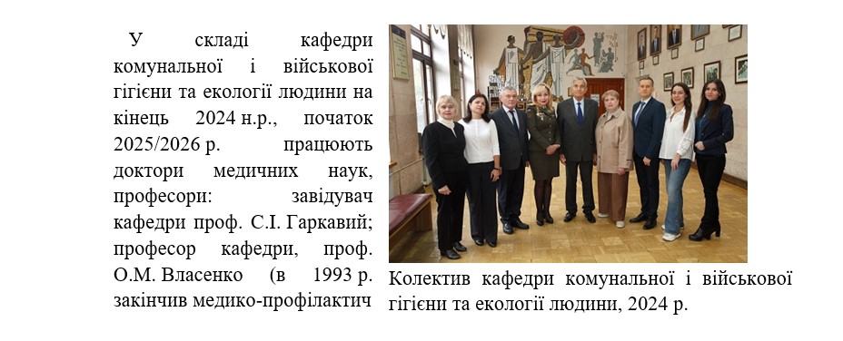 Історично так склалось, що на виконання наказу ректора ЗВО НМУ імені О.О. Богомольця за № 876 від 22.10. 2025 р. «Про реорганізацію/ліквідацію деяких кафедр НМУ імені О.О. Богомольця, їх перейменування та закріплення» (п.1.11) в Університеті кафедру комунальної і військової гігієни та екології людини об’єднили з кафедрою гігієни, безпеки праці та професійного здоров’я, утворивши кафедру гігієни, екологічного та професійного здоров’я.