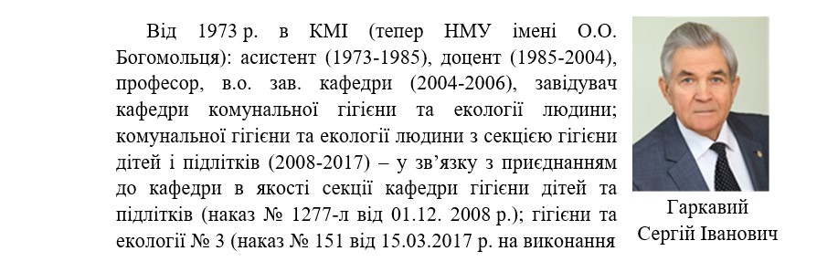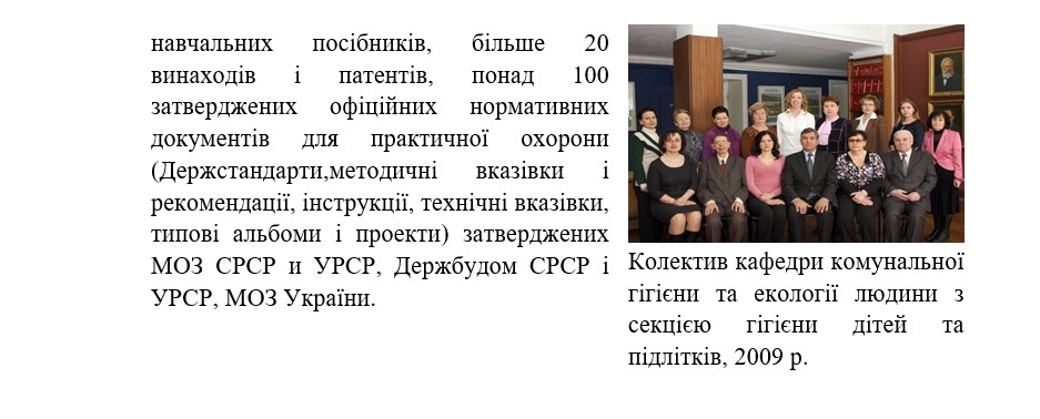 рішення Вченої Ради НМУ імені О.О. Богомольця від 23 лютого 2017 р., протокол № 9) у складі ФПЛЗСУ НМУ імені О.О. Богомольця; з 01.09.2023 р. кафедри комунальної гігієни та екології людини з курсом вікової гігієни, згодом кафедри комунальної і військової гігієни та екології людини у складі навчально-наукового інситтуту гроадського здоровґя та профілактичної медицини у зв’язкау з реорганізацією в останній медичного факультету № 4 НМУ імені О.О. Богомольця. Автор і співавтор понад 300 друкованих праць, серед яких 11 підручників, 6 навчальних посібників, 3 монографії, 3 книги; 9 винаходів, понад 30 нормативно-методичних документів і типових програм навчальних дисциплін для студентів вищих медичних навчальних закладів України ІІІ-ІV рівнів акредитації, що затверджені МОЗ України.