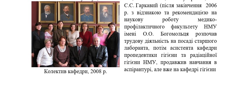 та екології. Пройшов стажування в Греції, Університеті Арістотеля, місті Салоніки в рамках проєкту Європейського союзу «Erasmus Mundus External Cooperation Window Lot 6». Виконав і захистив у 2012 р. кандидатську дисертацію на тему «Гігієнічна оцінка динаміки міграції метил трет-бутилового ефіру в ґрунті» під науковим керівництвом проф. С.Т. Омельчука, вільно володіє англійською мовою (С), з 2013 р. переведений на просаду асистента, згодом доцента кафедри комунальної гігієни та екології людини з секцією гігієни дітей та підлітків (з 2017 р. гігієни та екології № 3 у складі ФПЛЗСУ), з 2024 р. продовжив наукову діяльність на посаді завідувача лабораторії біоцидів і токсикології в ДУ «Інститут громадського здоров’я ім. О.М. Марзєєва НАМН України); Р.В. Горбачевський , асистенти, к.мед.н. Т.О. Туманова , Р.Т. Бевз, аспіранти, згодом асистенти А.І. Бурлака, О.С. Кондратюк, Т.В. Руда, старший лаборант В.А. Горбачевська. На кафедрі працювали асистент Д.Л. Лебедев; старший лаборант Т.Р. Шлаган; лаборант К.Г. Городецька інші співробітники.