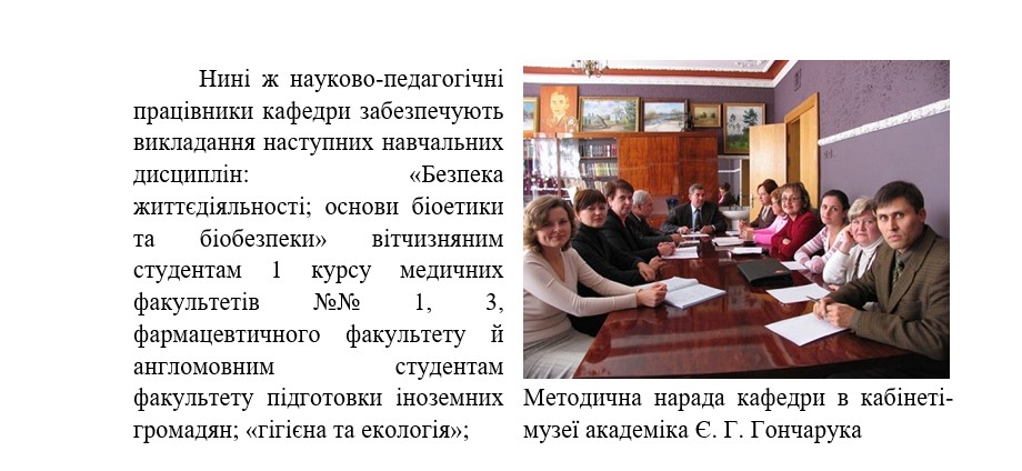 Колектив кафедри в різні періоди забезпечував викладання навчальних дисциплін «комунальна гігієна» та «гігієна дітей та підлітків» студентам 6-го курсу 4-го медичного факультету, які навчалися за спеціальністю «медико-профілактична справа»; «гігієна та екологія» студентам 3-го та 6-го курсів медичного факультету № 3, які навчаються за спеціальністю «педіатрія», факультету підготовки лікарів для збройних сил України (ФПЛЗСУ), російськомовним іноземним студентам, які навчалися за спеціальністю «лікувальна справа». Вітчизняні та англомовні студенти фармацевтичного факультету (денної та заочної форми навчання) вивчають на кафедрі «основи екології» (І-й курс), «гігієна у фармації», «гігієна та промислова санітарія» (3 курс); «екстремальна медицина» (4 курс). Студенти медичних факультетів, які навчаються за фахом «лікувальна справа» опановують на кафедрі на 2 курсі навчальну дисципліну «домедична допомога в надзвичайних ситуаціях» (вітчизняні студенти медичного факультету № 2) та «медицина надзвичайних ситуацій» (російськомовні іноземні студенти), а на 4 курсі «цивільний захист».