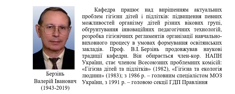 З 1985 до 2008 р. кафедру очолював член-кор. НАПН України, професор В.І. Берзінь (1943-2019). За цей час відбулося не лише поглиблення і розширення тематики напрямків гігієнічних досліджень, але й впровадження сучасних методів дослідження та обробки наукової інформації.
