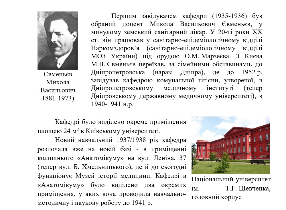 Отже кафедра комунальної гігієни як самостійний підрозділ в Київському медичному інституті (КМІ) була утворена в 1935 р. шляхом об’єднання доцентур санітарної гідротехніки, геології і метеорології, опалення та вентиляції, будівельної техніки, житлово-комунальної санітарії, які з 1930 р. функціонували у складі кафедри загальної гігієни КМІ. У той період, в 30-х роках для забезпечення більш ґрунтовної освіти з медико-профілактичних дисциплін на санітарно-гігієнічному факультеті КМІ, крім кафедри комунальної гігієни створили також самостійні профільні кафедри: епідеміології в 1932 р., шкільної гігієни та гігієни харчування в 1935 р.