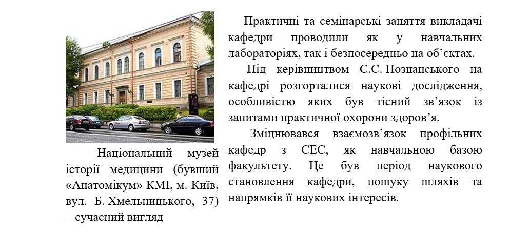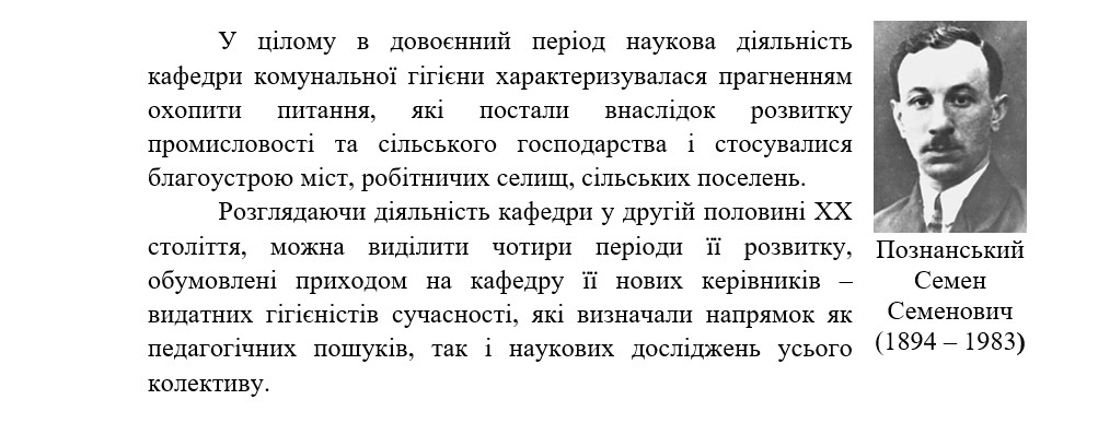 Завідувачем кафедри тоді було обрано відомого гігієніста – доцента С.С. Познанського, першого декана санітарно-гігієнічного факультету КМІ. Завідувач кафедри читав курс лекцій з комунальної гігієни для студентів.