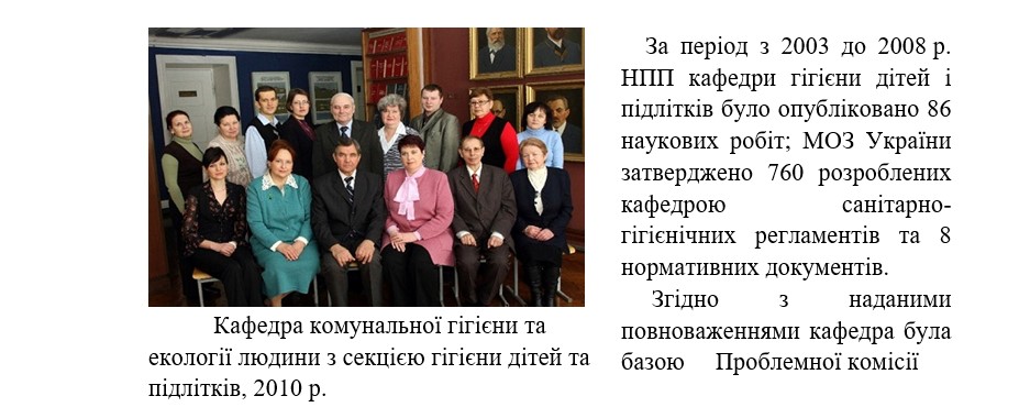 гігієни дітей та підлітків та виконувала роль республіканського центру з навчально-методичної роботи, координувала та рецензувала видання навчально-методичного характеру, приймала інтернів та профільних викладачів для проходження підвищення кваліфікації та атестації лікарів. Усі види діяльності кафедри здійснювалися у тісній співпраці з науково-дослідними інститутами НАМН і НАПН України, МОЗ, МОН України, НАПН України (професор В.І. Берзінь – був членом Координаційної ради та Бюро НАПН України; членом 2-х спеціалізованих рад). На кафедрі вивчали гігієну та екологію людини студенти III курсу фармацевтичного факультету (V семестр), загальну гігієну (V, VI, VII семестри медичного факультету №3), гігієну дітей та підлітків (ХІ-ХП семестри медичних факультетів (№ 1-4), ФПЛЗСУ, Чернігівського філіалу медичного факультету № 4). Навчання профілізовано за спеціальностями: “фармація”, “педіатрія”, “лікувальна справа”, “медико-профілактична справа”. Викладачами кафедри систематично проводилася підготовка студентів до ліцензійних іспитів “Крок Фармація, “Крок-2”. Кафедра ГДП була опорною серед однопрофільних кафедр, спрямовувала науковий пошук на вирішення актуальних проблем в галузі гігієни дітей та підлітків. На кафедрі була виконана НДР за завданням МОЗ України з теми: «Дати гігієнічне обґрунтування реабілітаційним заходам з метою забезпечення сприятливого перебігу адаптаційних процесів при вступі до школи дітей, які постраждали від Чорнобильської аварії»; виконана НДР «Дати гігієнічну оцінку організації оздоровлення молодших школярів міста Києва»; «Дати гігієнічне обґрунтування організації навчально-виховного процесу в школі І ступеню згідно з Концепцією загальної середньої освіти». Матеріали наукових досліджень кафедри широко представлені на сторінках фахових видань. На кафедрі функціонував студентський науковий гурток, в якому працювали студентів III-IV курсу медичного факультету №3. За результатами їх роботи у 2004 р. підготовлено 8 доповідей на міжнародну конференцію студентів та молодих вчених.