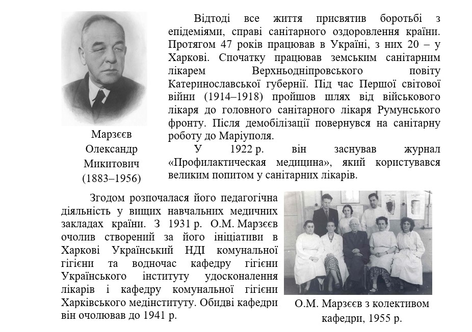 Перший, повоєнний, період діяльності кафедри щільно пов’язаний з іменем заслуженого діяча науки, дійсного члена бувшої АМН СРСР Олександра Микитовича Марзеєва (1883-1956). Після визволення м. Києва від німецької окупації ММІ реевакуювався. В інституті відновилася діяльність санітарно-гігієнічного факультету, його кафедр. У 1944 р. завідувачем кафедри комунальної гігієни був обраний заслужений діяч науки, дійсний член АМН СРСР О.М. Марзєєв, який водночас очолював НДІ загальної і комунальної гігієни та кафедру комунальної гігієни Інституту вдосконалення лікарів у Києві. Керував він кафедрою до кінця свого життя. Поруч із О.М. Марзеєвим на кафедрі працювали доцент А.М. Іздебський, асистенти М.В. Крижанівська (згодом д. мед. наук, професор), Т.К. Ігнатьева, Г.М. Березівська, Н.М. Гургенова, старший лаборант-хімік Л.В. Дідківська, аспіранти М.П. Дудник, Ф.І. Богомолов, І.Л. Курінний. До проведення практичних занять на умовах погодинної оплати праці залучалася канд. мед. наук П.В. Малежик – завідувач лабораторії водопостачання НДІ загальної та комунальної гігієни.
