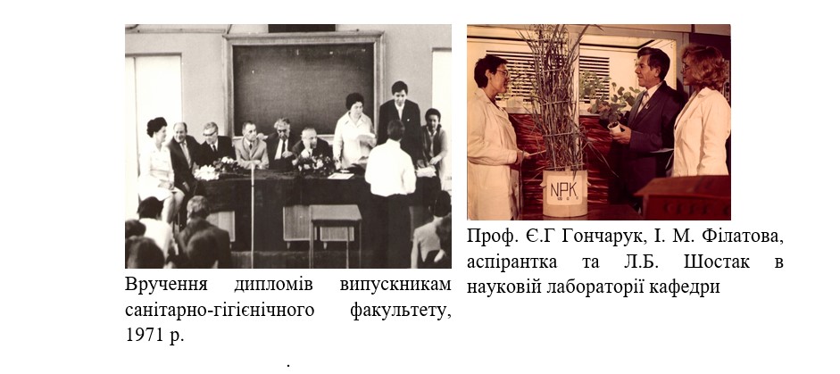 Наукові дослідження, що виконувалися на кафедрі учнями проф. Є.Г. Гончарука, які підготували та успішно захистили за цей період кандидатські та докторські дисертації (Е.В. Шуляк, Б.М. Дучинський, В.І. Ципріян, В.О. Прокопов, Л.М. Авраменко, В.О. Волошин, С.І. Гаркавий, О.В. Салата, М.Г. Федосенко, В.П. Гайдук, О.П. Половцев, Н.Т. Музичук, О.С. Спасов, В.К. Боримский, В.В. Малашевський, В.І. Геєць, Л.Б. Шостак, О.С. Прокопович, О.В. Кузнецов, І.І. Ткаченко, А.В. Мелєнєвська, М.М. Коршун, І.М. Філатова та ін.), були присвячені вирішенню широкого кола практичних питань. Серед них – профілактика гострих кишкових інфекцій і інвазій серед населення шляхом санітарної охорони підземних джерел господарсько-питного водопостачання та малих річок від побутових і промислових стічних вод, очистки і знезаражування стічних вод, у тому числі стічних вод лікувально-профілактичних закладів, санітарної охорони грунту, благоустрою села. Водночас проводилися дослідження з попередження гострих і хронічних отруєнь населення екзогенними хімічними речовинами, які використовуються у сільському господарстві, шляхом наукового обгрунтування величин гранично допустимого вмісту їх у грунті.