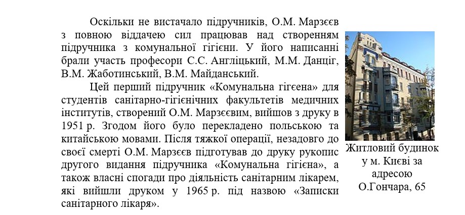 У зв’язку з нагальними потребами ліквідації наслідків війни, відновлення зруйнованих міст, сіл, об’єктів промисловості та сільського господарства, а також з огляду на перспективні плани розвитку економіки, народного господарства, культури, освоєння нових територій колектив кафедри під керівництвом О.М. Марзєєва працював над виконанням НДР: «Руйнування міст України в період війни та окупації та гігієнічні умови їх відновлення» і «Руйнування сільських населених пунктів в Україні в період війни та окупації і гігієнічні основи їх відновлення». Наукові дослідження були присвячені гігієнічній оцінці житлових умов населення Києва, вивченню ефективності малих квартальних печей для спалювання сміття, обґрунтуванню зони санітарної охорони курорту Ворзель. Перелік 186 праць О.М. Марзєєва засвідчує різнобічну діяльність і надзвичайно різноманітні наукові інтереси вченого.