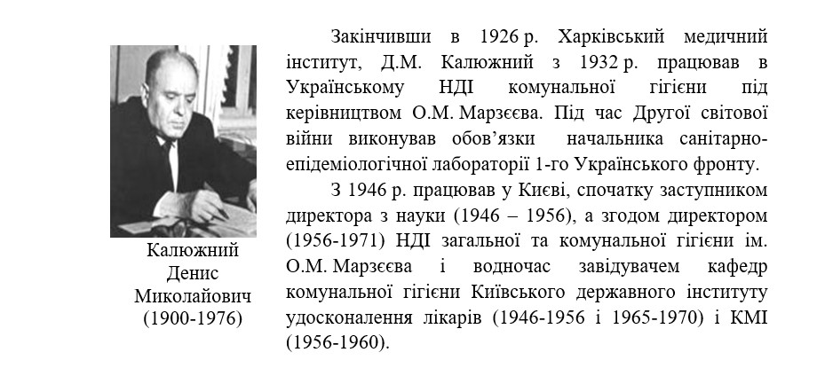 Другий повоєнний період у діяльності кафедри комунальної гігієни КМІ розпочинається в 1956 р., коли після смерті акад. О.М. Марзєєва її очолив його учень – член-кореспондент АМН СРСР, заслужений діяч науки УРСР, професор Денис Миколайович Калюжний.