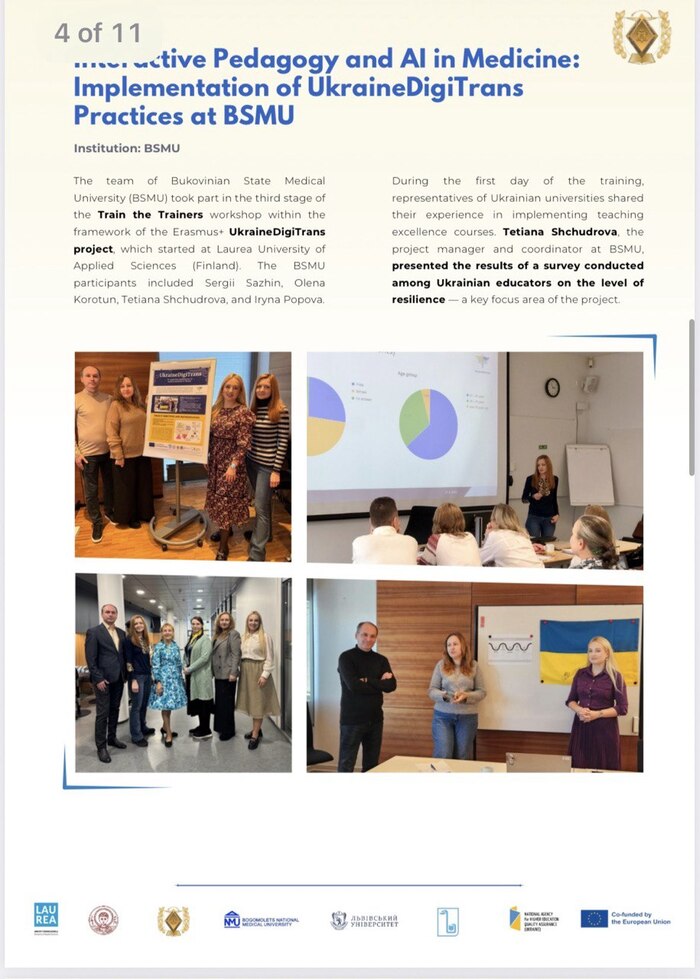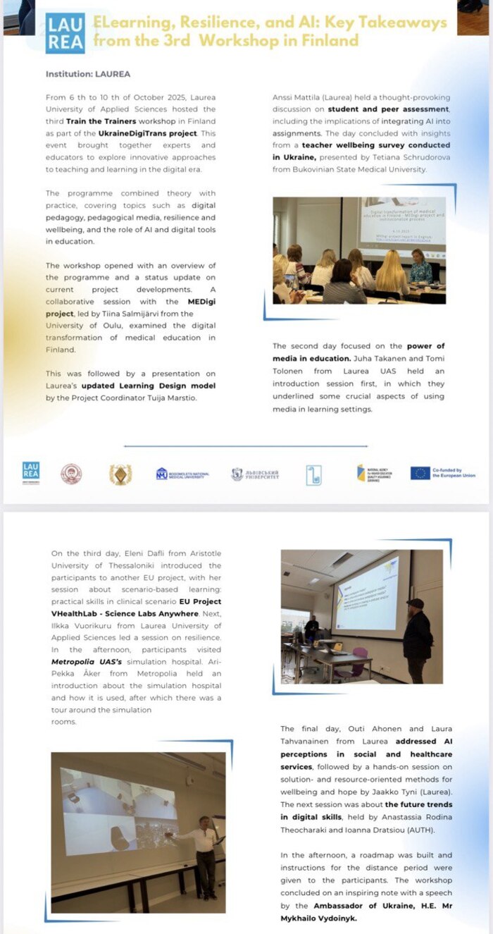 Ключовою подією цього періоду став третій міжнародний Train the Trainers workshop, який відбувся 6–10 жовтня 2025 року на базі Laurea University of Applied Sciences у Фінляндії. Захід об’єднав викладачів, дослідників і експертів з України, Фінляндії та Греції для обговорення сучасних підходів до навчання в умовах цифрової трансформації. Програма воркшопу гармонійно поєднала теоретичні засади з практичними кейсами та охопила питання цифрової педагогіки, навчального дизайну, педагогічних медіа, психологічної стійкості та добробуту викладачів, а також ролі штучного інтелекту й цифрових інструментів у медичній освіті.