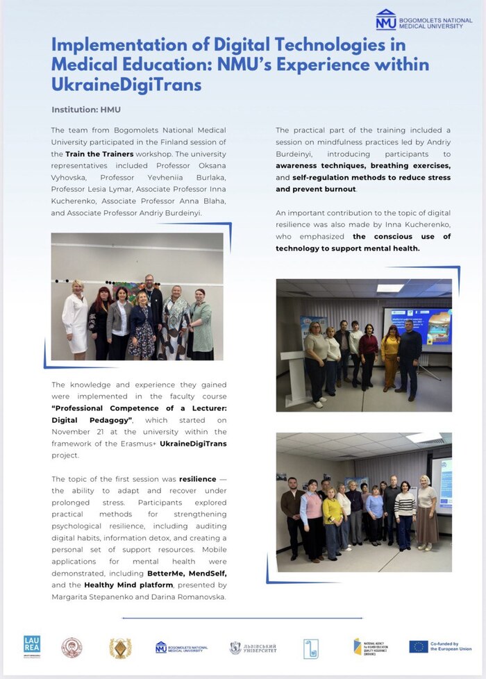 Активну участь у проєкті взяли й представники Національного медичного університету імені О.О. Богомольця. Набуті знання та досвід було інтегровано в курс «Професійна компетентність викладача: цифрова педагогіка», який стартував у межах UkraineDigiTrans. Значна увага в межах курсу приділяється розвитку психологічної стійкості викладачів, усвідомленому використанню цифрових технологій, профілактиці професійного вигорання, а також застосуванню сучасних мобільних застосунків для підтримки ментального здоров’я. Результати проєктної діяльності університету також були представлені на міжнародних конференціях, професійних заходах та освітніх виставках.