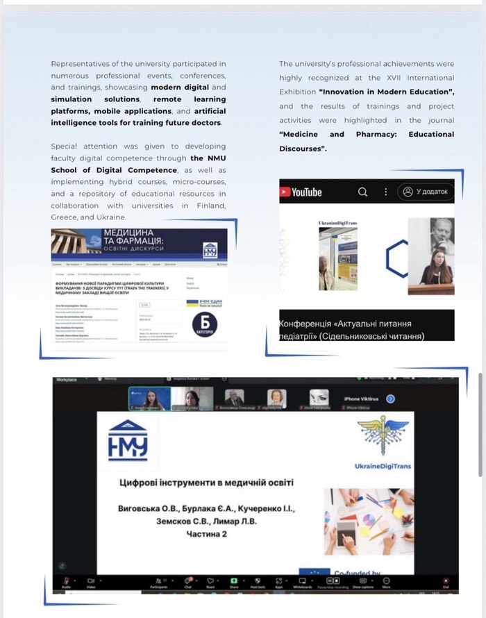 Крім того, проєкт сприяє міжнародній академічній співпраці, об’єднуючи українські медичні університети з європейськими партнерами, зокрема з Фінляндії та Греції. Обмін досвідом дозволяє адаптувати найкращі європейські практики цифрової педагогіки до українського контексту, зберігаючи високу якість освіти навіть в умовах криз і невизначеності.