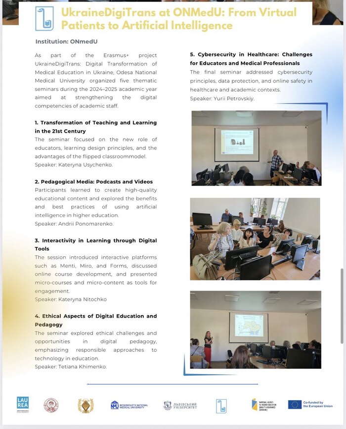 В Одеському національному медичному університеті в межах UkraineDigiTrans протягом 2024–2025 навчального року було організовано серію тематичних семінарів, спрямованих на розвиток цифрових компетентностей викладачів. Тематика заходів охоплювала трансформацію навчання в ХХІ столітті, створення педагогічних медіа, використання інтерактивних цифрових інструментів, етичні аспекти цифрової освіти та питання кібербезпеки в охороні здоров’я. Окремий цикл було присвячено штучному інтелекту – від загальних принципів і етики використання до правового регулювання, міжнародних і національних рекомендацій та практичної роботи з AI-інструментами.