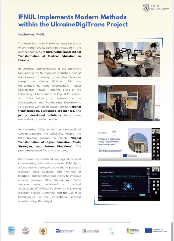Львівський національний університет імені Івана Франка також активно долучився до реалізації проєкту. Представники університету взяли участь у міжнародному воркшопі у Фінляндії, а згодом організували власний навчальний модуль, присвячений цифровій трансформації вищої освіти. Програма включала онлайн-лекції з розробки освітніх курсів, створення подкастів, використання зворотного зв’язку та рефлексивних інтерв’ю, а також практичні аспекти застосування штучного інтелекту в освітньому процесі. Важливою подією стало й представлення UkraineDigiTrans під час Erasmus+ Information Day, де було підкреслено значення міжнародного партнерства та якісної проєктної підготовки.