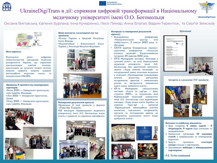 Проєкт UkraineDigiTrans є трансформаційною ініціативою у сфері медичної освіти в Україні, що поєднує цифрові інновації, оновлення педагогічних підходів та безперервний професійний розвиток викладачів. Реалізований за підтримки програми Erasmus+, проєкт став відповіддю на стрімку цифровізацію охорони здоров’я, а також на виклики, зумовлені війною, сприяючи переосмисленню підходів до викладання та навчання в медичних закладах вищої освіти.
