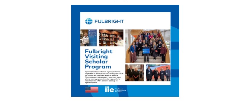 - Fulbright Visiting Scholar Program – проведення досліджень в університетах США, дослідницьких центрах, бібліотеках, музеях, архівах тощо тривалістю від трьох до дев’яти місяців. Кінцевий термін подання документів – 15 жовтня 2025 року.